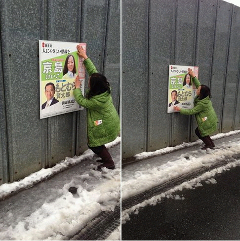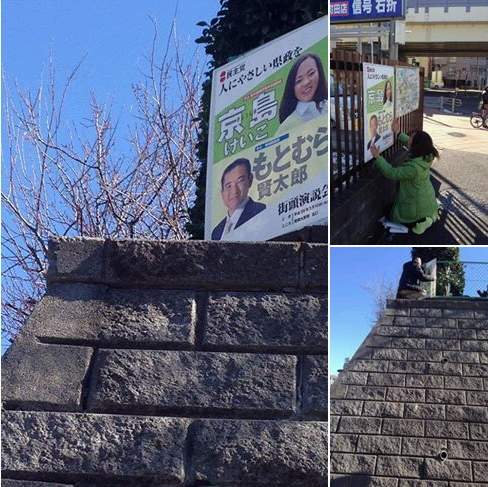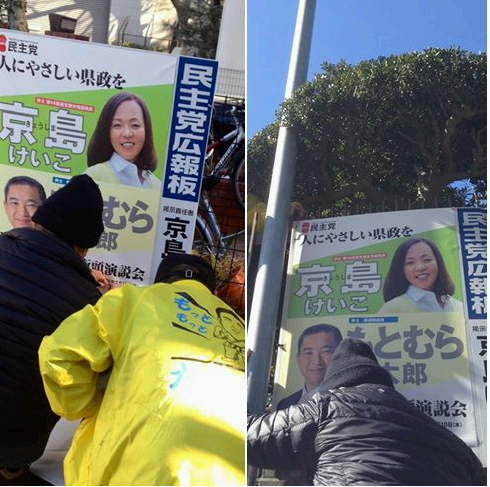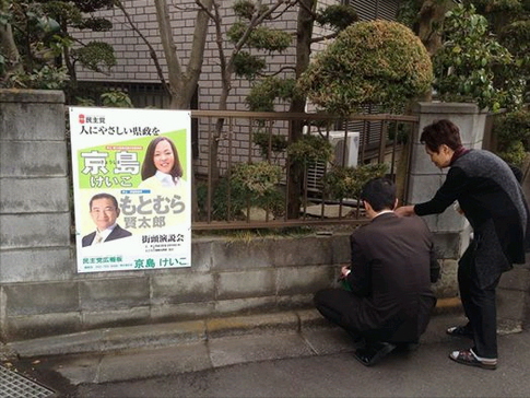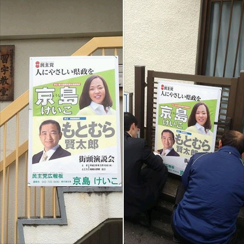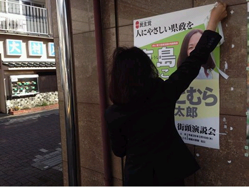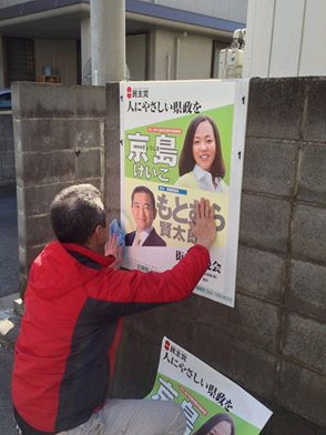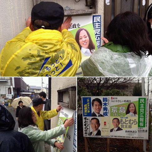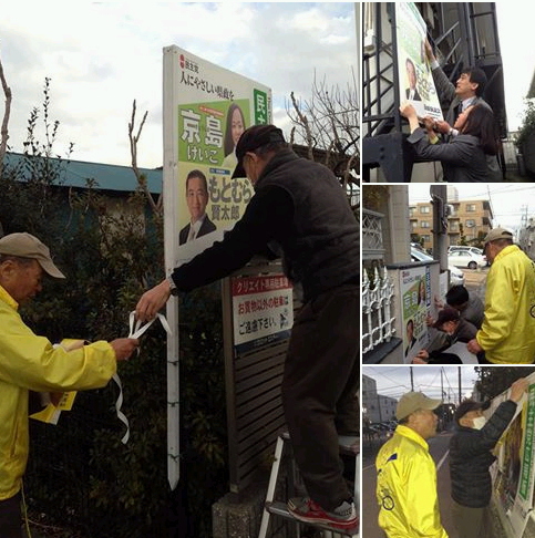 ポスター貼りを鈴木秀成議員とボランティアの皆さん