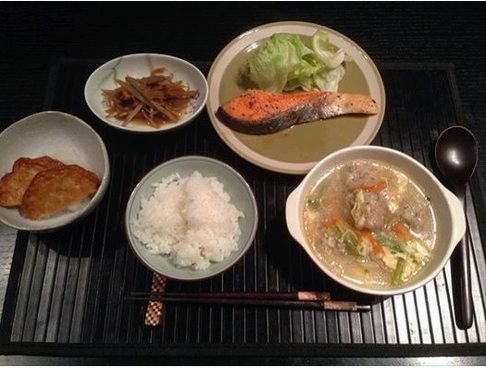 知人宅を訪ねると、餃子のタネを肉団子に変身させたスープと焼き鮭、