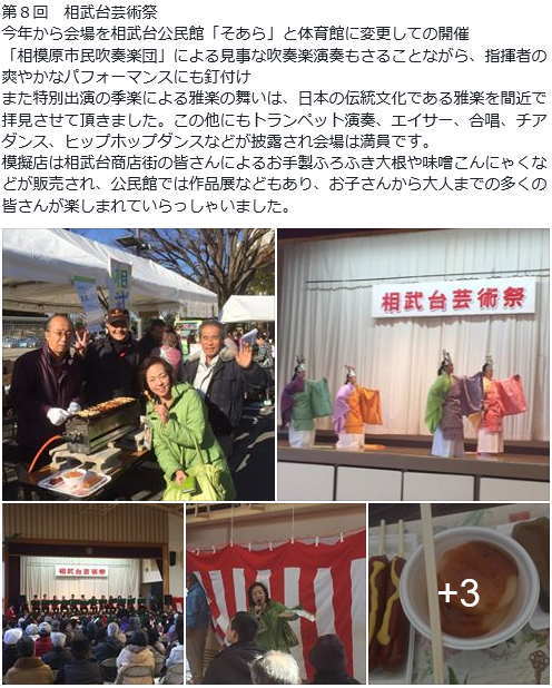 やし保存会、相模の無鉄砲太鼓、オカリナの演奏が行われたこともあり、